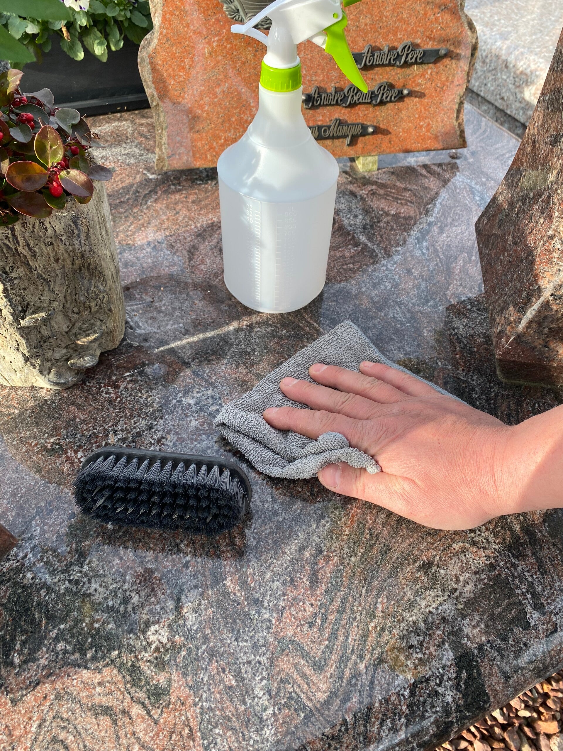 J'utilise des techniques respectueuses et des produits adaptés pour nettoyer en profondeur les monuments funéraires, redonnant à la pierre son éclat d'antan.